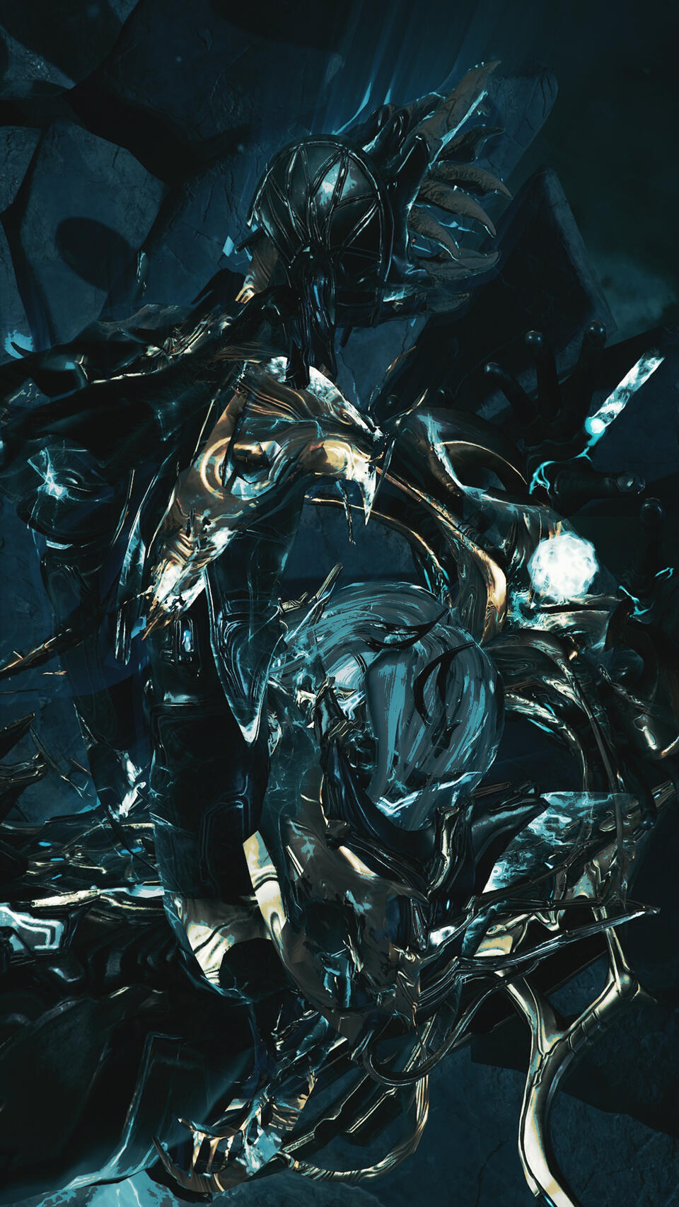 Eidola was never a name. Whenever it left the lips of her kin or those whom come to refer to her as it, one would only hear their breath and the void itself weaving a name only it knew. No one has noticed it yet. Where the void had sown, had left a ghost print they believe they've pressed upon. So that nameless name passes as they believe it does. But now it goes to show there are things better left alone. Especially the topic of names and that ghost title. The Orokin themselves almost named them in number-code. ππͺπ₯π°ππ’ was earned through violence. So even when it is said, she still turns her head. She knows *she's called upon without needing to be sounded. Intentions are a powerful thing. Especially when the Void's sensitivity is hyper reactive, bubbling with chaos if given the chance. How could she not feel it? It was a brushing of the skin she could feel so profound, it gave her directive.And this is who she is.She stands at the edge of things.Not the edge of maps or territories or known space. The edge of category. The place where definitions blur and certainties dissolve and the things you thought you knew about existence become suggestions rather than laws. There is an inky darkness spilling forth from KHRA and KALOHK. It pools around her as she makes use of it, obscuring herself in depths ever calling, stretching thin into the light through the unlight. This is a Tenno whom has seen the apathetic third way of being, and not like the chaos the man in the wall embraces as a void construct himself. This is a Tenno who has embraced the darker side of the moon never needing borrowed light to reflect her existence in relevance. Six feet, nine inches of void-steel and porcelain, cold and firm. Five hundred pounds of accumulated verdict, evenly placed throughout her flesh vessel, with a spine that breathes with the rhythm of archived eternities lost to the bargain. Eidola, Apostasia, is adorned by a crown of seven points extending from her cervical vertebrae, reaching toward those same horizons that do not exist. Her black hands of obsidian majesty, cold and open, have never closed around anything they were not willing to release.She will not be found in the places where power gathers. She will not be among her divine collective. She will sit upon no throne, nor upon her Orokin claimed inheritance that isn't her dwarf β orbiting at the edge of a system that has very much forgotten she exists, or refuses to look her way, as she's left tracing the same elliptical path century after century, and this is no exile. This was her steadfast positioning. This is where her banners rose. And this is where they'll stay.It's tactical. From Pluto, she can see everything. From here, she can reach anything. From here, she can deliver her verdicts when verdict becomes necessary. It is solemn. The light here is old and ever aging. It has traveled and it still travels so far and so long that it forgets where it even came from, forgotten what it was supposed to illuminate, forgotten everything except the habit of moving forward. And it falls upon her without warmth, without purpose, without the faintest interest in what it reveals, even on her graceful void given iridescent hue. Standing over the weeping unlight, you'll see something about the way she stands. Grounded. Like she's been there forever and will be there forever and your presence is a temporary thing she's politely tolerating. Not because she's unfriendly. She's one to if spoken to. She'll answer questions if asked them. She'll stand there, her and her five hundred pounds of accumulated something, and let you be in her presence for as long as it need be.Eidola. Apostasia. She's curious.
