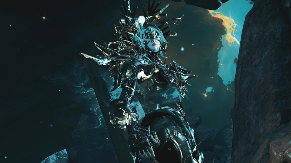 Eidola was never a name. Whenever it left the lips of her kin or those whom come to refer to her as it, one would only hear their breath and the void itself weaving a name only it knew. No one has noticed it yet. Where the void had sown, had left a ghost print they believe they've pressed upon. So that nameless name passes as they believe it does. But now it goes to show there are things better left alone. Especially the topic of names and that ghost title. The Orokin themselves almost named them in number-code. ππͺπ₯π°ππ’ was earned through violence. So even when it is said, she still turns her head. She knows *she's called upon without needing to be sounded. Intentions are a powerful thing. Especially when the Void's sensitivity is hyper reactive, bubbling with chaos if given the chance. How could she not feel it? It was a brushing of the skin she could feel so profound, it gave her directive.And this is who she is.She stands at the edge of things.Not the edge of maps or territories or known space. The edge of category. The place where definitions blur and certainties dissolve and the things you thought you knew about existence become suggestions rather than laws. There is an inky darkness spilling forth from KHRA and KALOHK. It pools around her as she makes use of it, obscuring herself in depths ever calling, stretching thin into the light through the unlight. This is a Tenno whom has seen the apathetic third way of being, and not like the chaos the man in the wall embraces as a void construct himself. This is a Tenno who has embraced the darker side of the moon never needing borrowed light to reflect her existence in relevance. Six feet, nine inches of void-steel and porcelain, cold and firm. Five hundred pounds of accumulated verdict, evenly placed throughout her flesh vessel, with a spine that breathes with the rhythm of archived eternities lost to the bargain. Eidola, Apostasia, is adorned by a crown of seven points extending from her cervical vertebrae, reaching toward those same horizons that do not exist. Her black hands of obsidian majesty, cold and open, have never closed around anything they were not willing to release.She will not be found in the places where power gathers. She will not be among her divine collective. She will sit upon no throne, nor upon her Orokin claimed inheritance that isn't her dwarf β orbiting at the edge of a system that has very much forgotten she exists, or refuses to look her way, as she's left tracing the same elliptical path century after century, and this is no exile. This was her steadfast positioning. This is where her banners rose. And this is where they'll stay.It's tactical. From Pluto, she can see everything. From here, she can reach anything. From here, she can deliver her verdicts when verdict becomes necessary. It is solemn. The light here is old and ever aging. It has traveled and it still travels so far and so long that it forgets where it even came from, forgotten what it was supposed to illuminate, forgotten everything except the habit of moving forward. And it falls upon her without warmth, without purpose, without the faintest interest in what it reveals, even on her graceful void given iridescent hue. Standing over the weeping unlight, you'll see something about the way she stands. Grounded. Like she's been there forever and will be there forever and your presence is a temporary thing she's politely tolerating. Not because she's unfriendly. She's one to if spoken to. She'll answer questions if asked them. She'll stand there, her and her five hundred pounds of accumulated something, and let you be in her presence for as long as it need be.Eidola. Apostasia. She's curious.